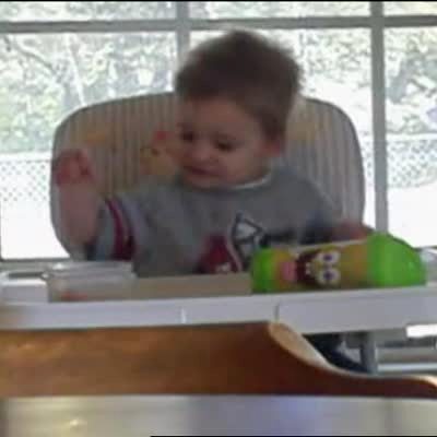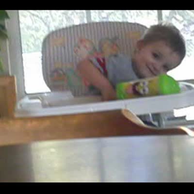 Tot boy in a high chair bangs his head on the table & giggles. The table falls when boy plays with it, boy slips out of the chair & cries.