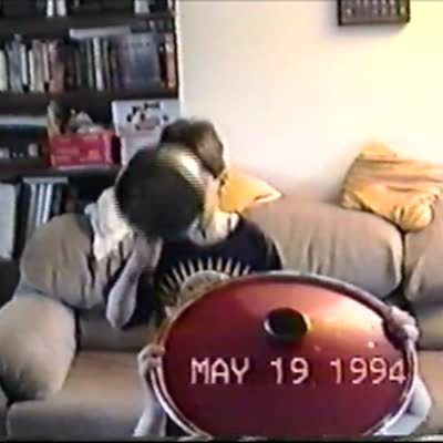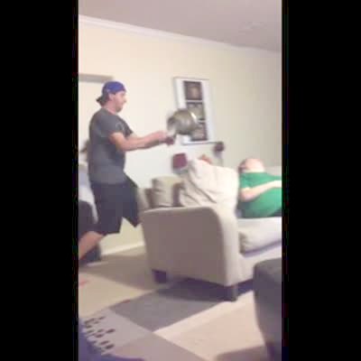 A woman sleeps on a couch indoors when a man bangs pans over her head indoors. The banging doesn't wake her up but a pan breaks off the handle and falls on her head.