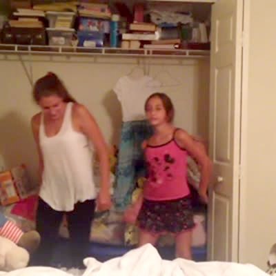 Two young girls do a dance routine where one of them smashes their head into the closet door indoors.