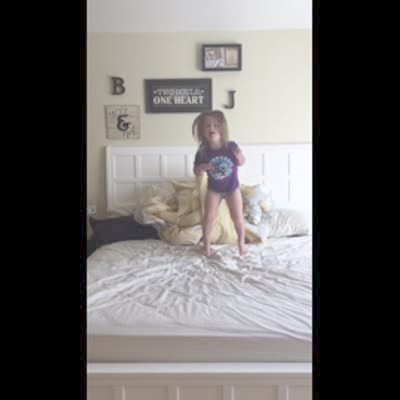 Teen girl jump on a bed and bangs her head on the overhead light.
