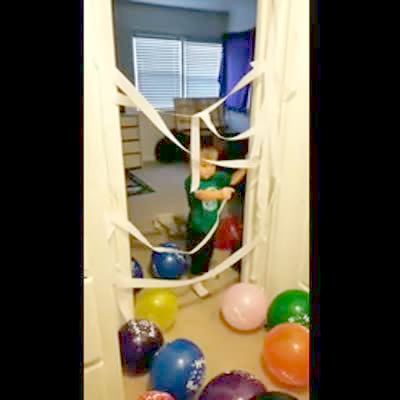 A tot boy stands in a bedroom with streamers and balloons. A man attempts to crouch under the streamers to get into the bedroom and bangs his head on the door frame.