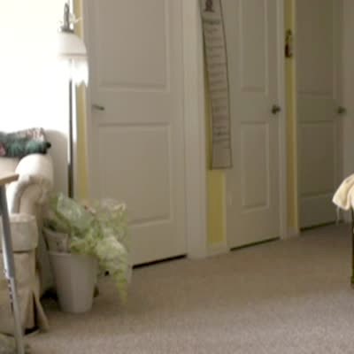 A woman walks back into a kitchen and bangs her head into an open cabinet door. Security footage.