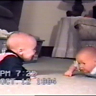 2 tot boys dance in the kitchen, they run into each other and start crying.
