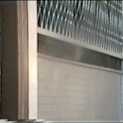 A woman closes the garage door and tries to run under the door but also jump over the sensor but she bangs her head and falls and the door opens back up. Security footage.