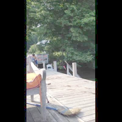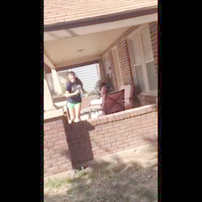 A teen girl attempts to put a hammock together in a yard but she bangs herself in the head with one of the poles. Security footage.