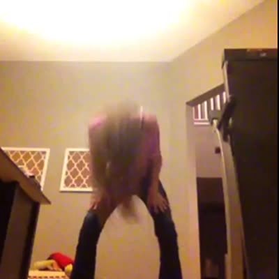 A teen girl dances/ head bangs indoors and hits her head on a treadmill next to her.