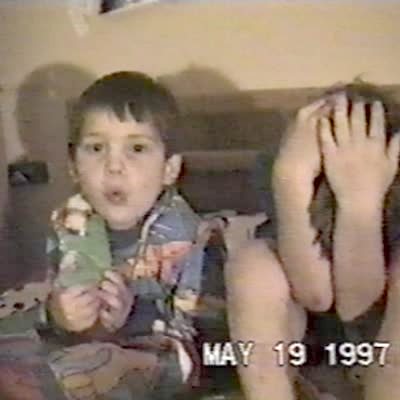 A teen boy runs up a driveway and bangs his head into the garage door as it lifts up. Security footage.