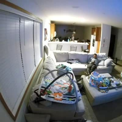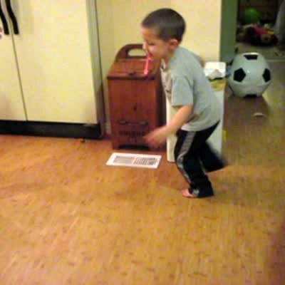 A man does the credit card drop trick to his young boy in the house, and the boy bangs his head on the wall before he drops the card.