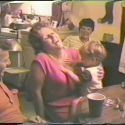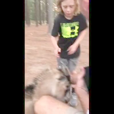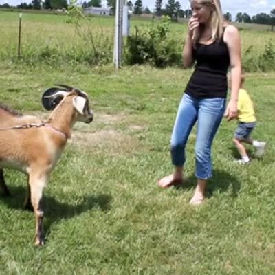 A young boy pets a goat outside as a woman says, "Pet her some more. She's nice, see?" As he pets her some more, the goat headbutts her.