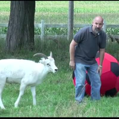 White horned Alaskan Dall Sheep passes a big red soccer ball back to man in a field by hitting it with his head / horns.