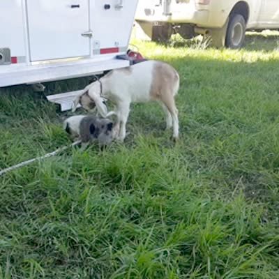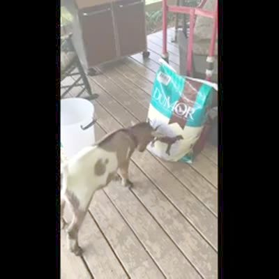 A goat headbutts a puppy dog repeatedly when the dog tries to play with the goat.