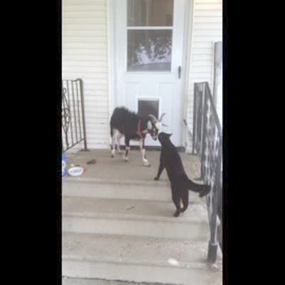 A goat stands on the front steps of a house outdoors and blocks a cat from the door. The cat gets closer and the goat headbutts it and the cat falls down the stairs.