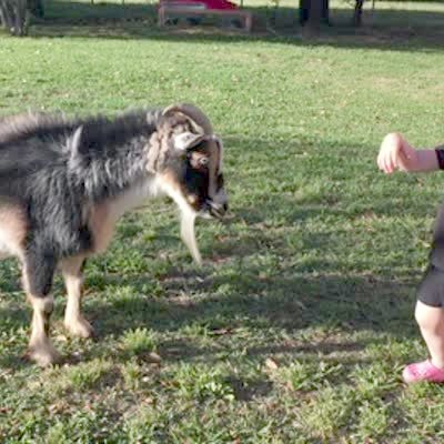 "Headbutting Buddies" Teen boy wearing a football helmet lowers his head at a ram and lets the ram head butt him. Ram then chases teen around an outdoor pen. Goat.