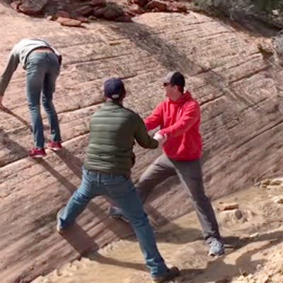 Two men stand at the bottom of a rock and link arms to catch a teen boy when he does a trust fall off the rock, but when the boy lands in their arms, he pulls them in and they bump heads with each other and drop the boy.