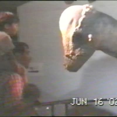 Animatronic dinosaur head butts man. At the Morristown museum.