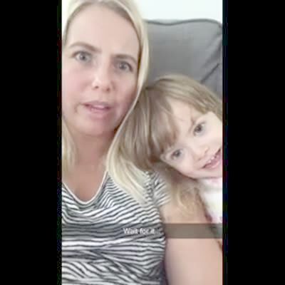 A woman sits on a living room couch with a tot girl. The tot girl headbutts her shoulder over and over. Another tot girl then headbutts her really hard in the face.