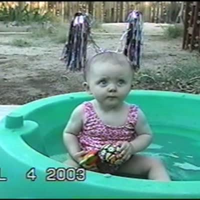 Tot girl sitting in her pool has a head band made of tassles. Funny visual