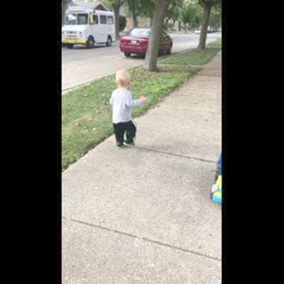 A tot boy pushes a toy truck down a sidewalk, but stops to dance when he hears music play from an ice cream truck that comes down the road.