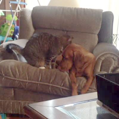 A cat rubs against a dog's head in a chair indoors. They hear something and both perk up.