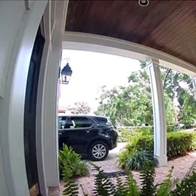 A man helps a woman carry a cactus in a pot up onto a porch. The cactus hits the roof then a piece breaks off and hits his ear. Security footage.