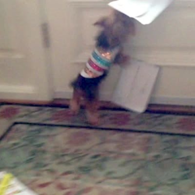 A yorkshire terrier dog sleeps quietly until she hears mail coming through a slot and she jumps up and rips the mail away from the mail man, shaking it around by the front door.