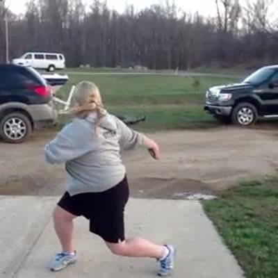 A man is filming his teen daughter prepare to throw a discus. She releases too soon and hits the camera out of his hands. You can hear the dad say "we're not doing that anymore."