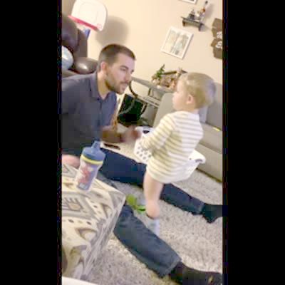 A dad stands in a kitchen and asks his tot boy who his best friend is and the tot says his dad. He tells his dad to whisper so his mom doesn't hear.