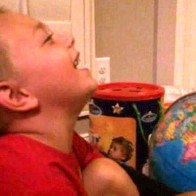 Boy tapes himself goofing around with an acoustic guitar. It breaks in half. he whimpers and yells (off camera) "Mom the guitar broke in half and I was just playing it!" The last part is hard to hear.