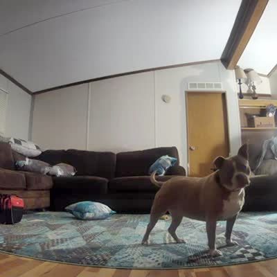 "Camera Confuses Canines" A dog sits on the living room floor and reacts with a bark when its owners talk via the Ring camera. Another big dog comes out after it hears its owners. A man and woman cackle when both dogs put their faces up to the camera to investigate. Security footage.