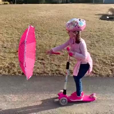 A young girl on a scooter holds an umbrella in front of her. The wind pushes her forward like a sail. Then she falls.