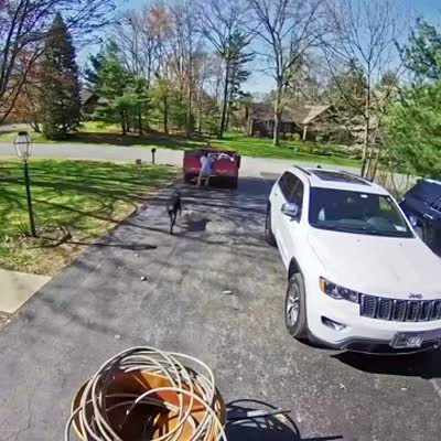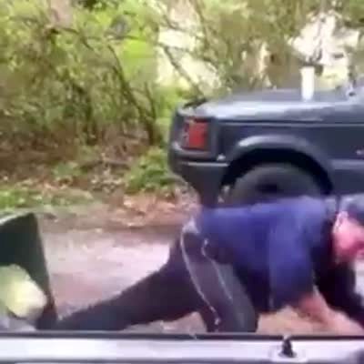 A man pours gravel into a large dumpster which sits in a driveway. When the dumpster starts to roll down the driveway, he holds on and slides with it. He shouts, "no, no no!" Security footage.