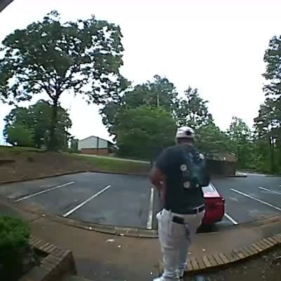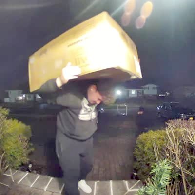 A man opens the front door while holding a package box on his back. Then the package falls, knocking the man's father onto the ground. Security footage.