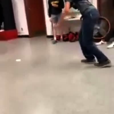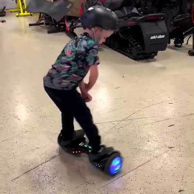 A young boy dances on a hover board before he eventually falls to the ground. Music rights not cleared.