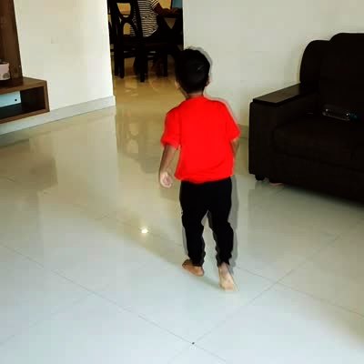 A young boy runs down a hallway with a helmet on and holding a broom. He says, "I am a ninja" over and over. Then he runs into the wall, falls, and says he is OK.
