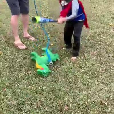 A young boy swings a bat at a pinata in the backyard. The intact pinata falls on the ground and a man picks it up but the boy continues to swing the bat and he hits the man in the groin. The man runs away and the boy chases him while he continues to swing the bat.