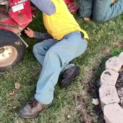 A man was pranked by a fake snake while he fixed a machine outside in a yard. The man screams with fear when he sees the "snake" and then runs away while his friends laugh.