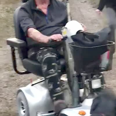 A senior man on a scooter rides down a hill into a yard accompanied by his family. Around 1:35 he attempts to drive the scooter up a ramp onto a porch but he drives over the porch and crashes through a wooden fence and falls over the other side of the porch.