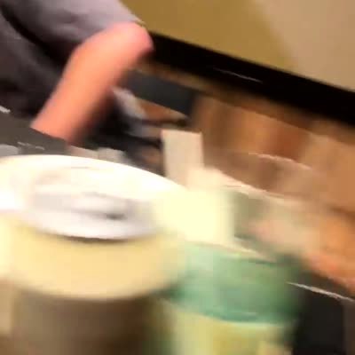 A dad tries to cook an onion volcano and it catches on fire on a hibachi grill in a kitchen and a young girl and young boy look scared.