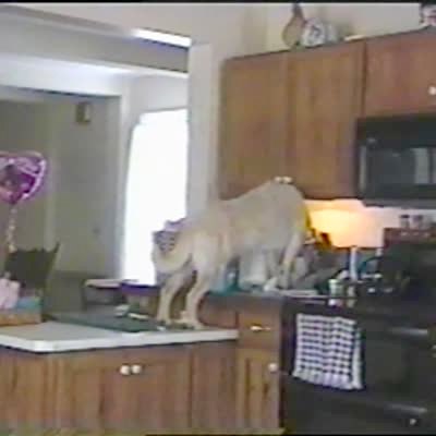 Dog on kitchen counter lifts cookie jar with its teeth, knocks it over & breaks it. Sneaky, caught, hidden camera, stealing.