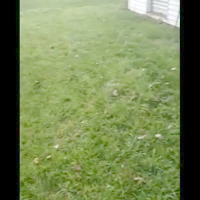 A beagle dog runs away and crawls under a house outdoors when his owner asks if he wants to take a bath.