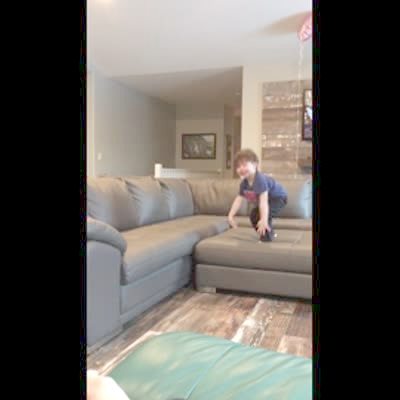 A tot boy stands on a couch. His father pops from behind the couch and scares him and the son flips backwards and lands head first on the living room floor.