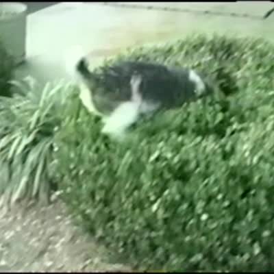 Small dog chasing tennis ball. Dog jumps headfirst into the top of a bush to get tennis ball placed in the middle .