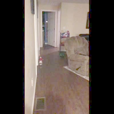 Young boy with a blindfold on plays Marco polo in the house. He runs head first into a wall, hard