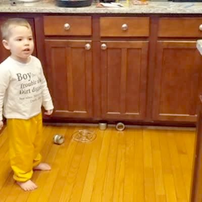 A tot boy makes his mom say, "where's Jamo and Oliver?" as he plays hide and seek in the kitchen, then he opens up the cupboards and a baby boy falls out onto the floor.