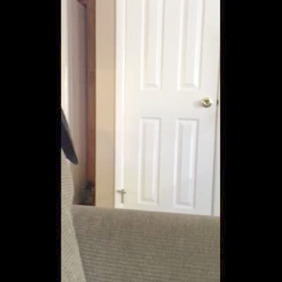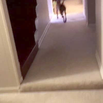 Woman & tiny dog play hide and seek. Woman hides in corner & puppy finds her. Puppy hides in a paper bag for her turn. Cute. Silly pet tricks. Letterboxed.