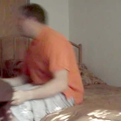 Man lays on a bed counting to 25 to play hide and seek with kids. Young boy runs in and punches him in the groin for no reason. Crotch hit.