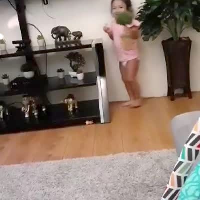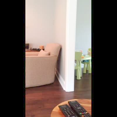 A tot girl falls and runs around the house looking for a hiding spot before hiding right in front of her father indoors.