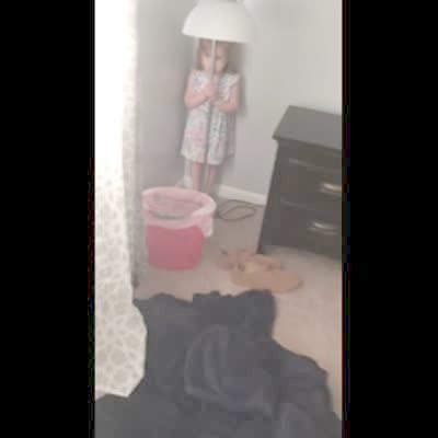 A tot girl plays hide and seek with her grandpa in the living room and he stands next to the door with a lampshade on his head, but she can't find him. Eventually, she finds him.