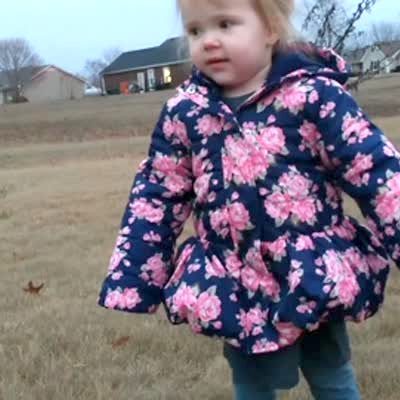A woman (behind the camera) counts to ten for hide and seek, and her tot girl picks up a tiny plant and holds it in front of her face.