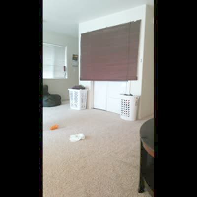 A woman throws a ball to a Labrador dog, then she hides underneath a blanket on a living room floor. The dog retrieves the ball and looks for the woman, then she talks to it and it finds her. The Disappearing Human Trick
